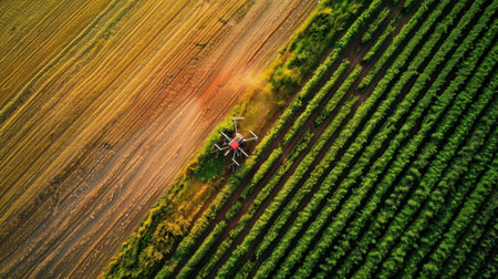 An aerial perspective showcases a drone actively spraying crops in a lush, green field. The contrasting colors of the fields highlight modern farming techniques.