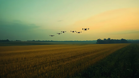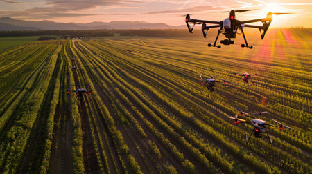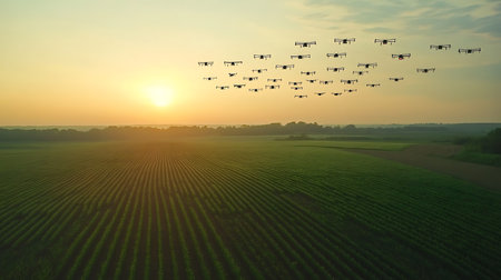 Multiple agricultural drones flying over a lush green crop field at sunrise with advanced technology monitoring plants and automated farming innovation.
