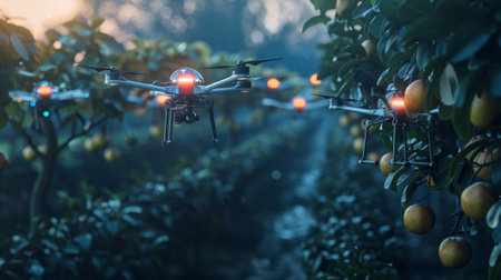 Drones harvesting apples in orchard at sunset, embracing future of farming technology