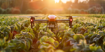 An unmanned drone hovers above a vibrant green crop field, with the sun casting a golden hue over the lush plantation.