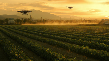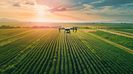 Drones capture stunning aerial views of farmland at sunset highlighting agricultural technology in action.