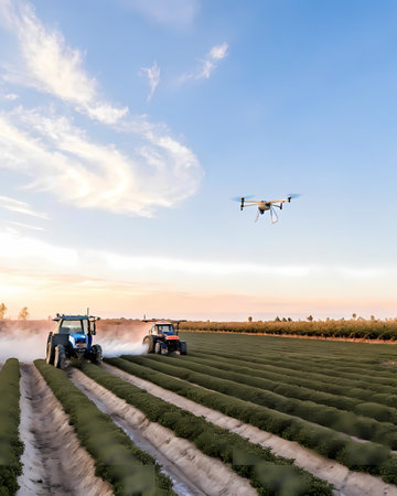 This AI-generated image shows a wide view of a contemporary agricultural field under a partly cloudy sky with soft sunlight near the horizon. A single agricultural drone is prominent in the upper right of the frame, suggesting its use for field monitoring or operations. Below, two modern tractors are working in the field with cultivated rows of green crops, kicking up dust as they move. The tractor on the left is larger and blue, while the one on the right has orange accents. The scene conveys the integration of aerial technology with traditional ground-based farming. This conceptual image, created with artificial intelligence, explores themes of modern agriculture, drone applications in farming, and the coexistence of automated and conventional machinery.