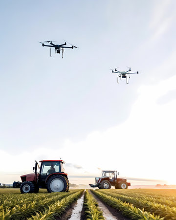 This AI-generated image captures a wide view of a modern agricultural field at sunset or sunrise, with warm golden light illuminating the scene from the right. Two contemporary farm tractors, one red and one older, are visible on a dirt path between rows of green crops. High in the clear sky, two agricultural drones are flying, indicating advanced aerial monitoring or farming operations. The composition emphasizes the clear sky and the expansive nature of the field, highlighting the integration of technology into traditional farming landscapes. This conceptual image, created with artificial intelligence, explores themes of precision agriculture, autonomous farming, and the evolving methods of food production