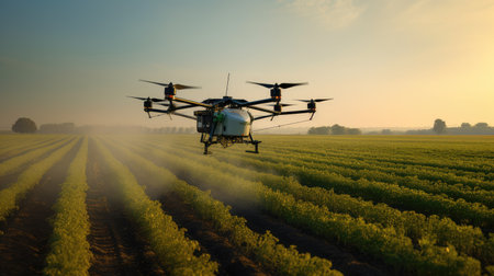 Drone spraying pesticide on soybean field in morning light, agriculture concept