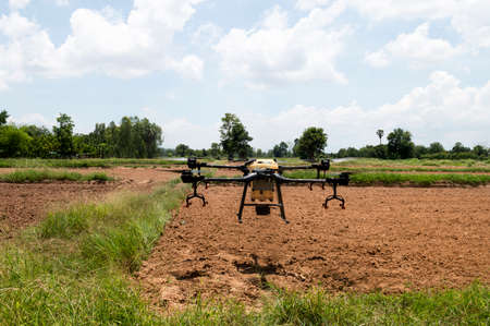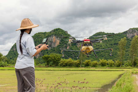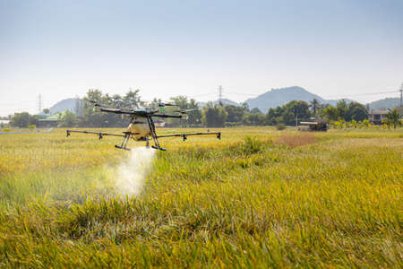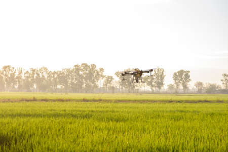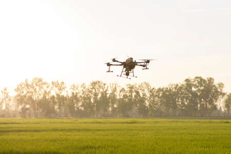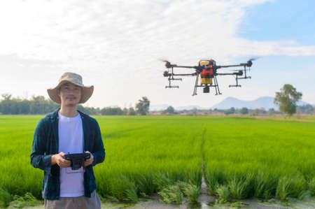 Farmers use agricultural drones to fly to spray fertilizer in rice fields. Drones, Agricultural, Industrial and Smart Farming