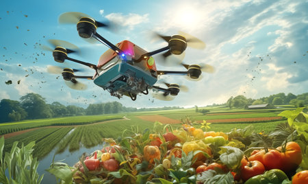 A modern drone with four rotors, gracefully carrying a netted bag filled with an assortment of colorful vegetables, hovering over a vibrant agricultural field. in the style of environmental awareness