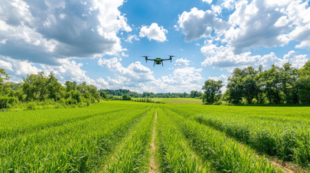 A drone hovers above a vibrant green field, capturing the essence of modern agriculture. The lush landscape and dynamic sky showcase the intersection of technology and nature.