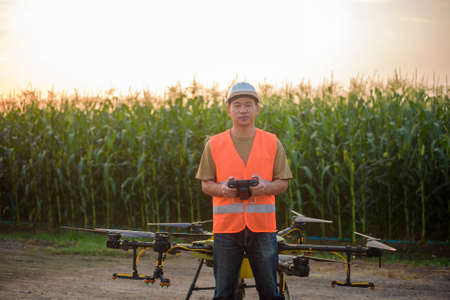 An Asian farmer uses agricultural drones to detect damage and growth of the crops he grows on his farm
