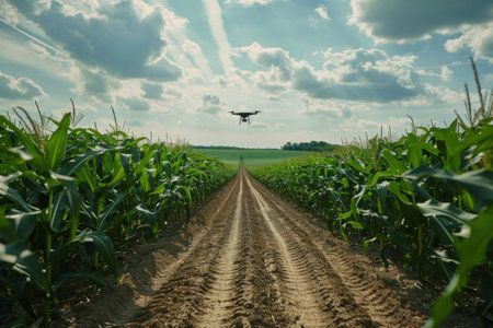 A drone hovers above a vibrant cornfield, capturing aerial views of the rows of corn while sunlight filters through. This activity highlights modern agricultural techniques.