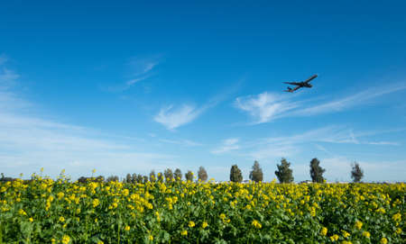 Munic Airport, Germany - October 12, 2019: Lufthansa airplane taking off over blooming agricultural field
