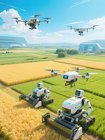 smart farm with automated machinery and drones, showcasing precision agriculture and technology-driven farming practices.