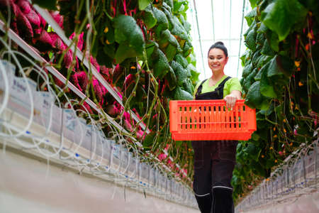 Gardener grower man carrying basket with fresh organic cultivated salad working at vegetable production in greenhouse using hydroponics system during farming season. Concept of agronomy