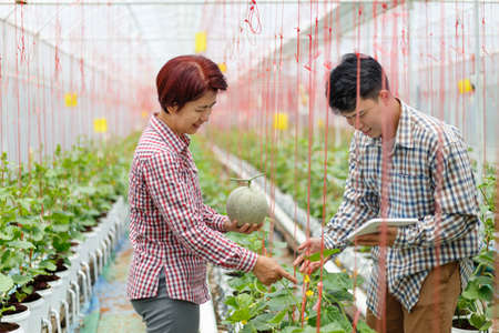 Farmers using tablet computer check the damaging diseases in melons leaves infected by downy mildew