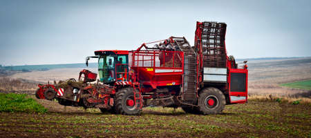 Agricultural vehicle harvesting sugar beet. Red combine harvester on field.