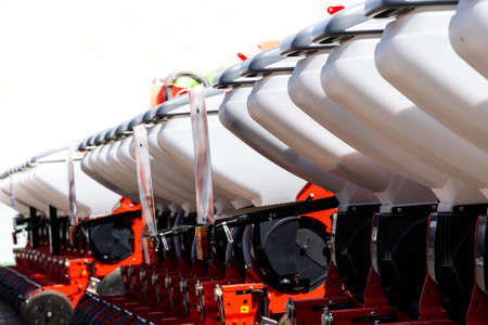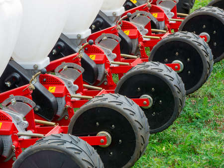 Close up of new sowing machine. Cereals seeding smart technology in agriculture