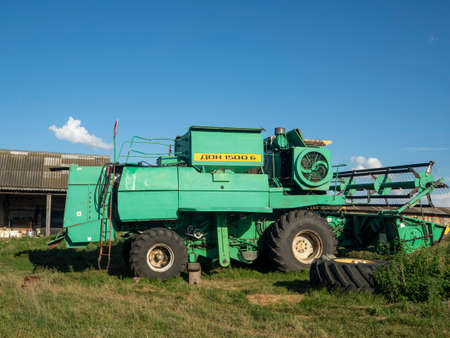 07/26/2020 Russia, Bryansk region. Green Agricultural Harvester. Agricultural machinery for harvesting. Concept of agriculture