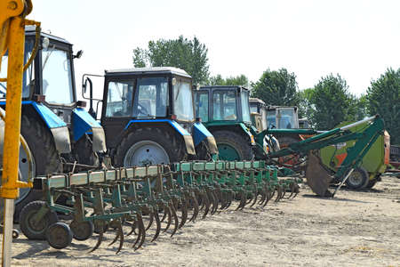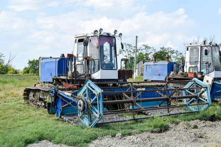 Russia, Temryuk - 19 July 2015: Tractor, standing in a row. Agricultural machinery. Parking of agricultural machinery.