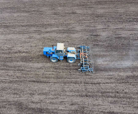 Tractor sowing seed on plowed field. Sowing seeds of corn and sunflower. Blue Tractor with disk harrow on plowing field. Seeding machinery on farm field. Seed sowing in farmland, aerial view.