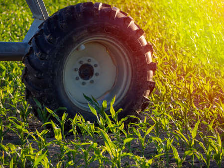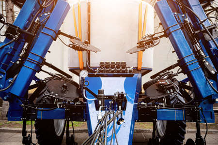 Russia, Leningrad Region - June, 2019: Working bodies of equipment for applying liquid fertilizers