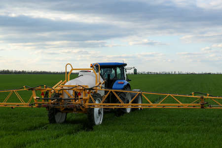 Tractor spraying pesticide in the field on spring day. agricultural industry