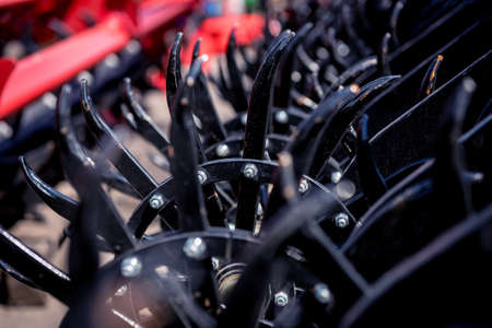 Russia, Leningrad Region - June, 2019: Working bodies of equipment for land cultivation. Agricultural machinery.