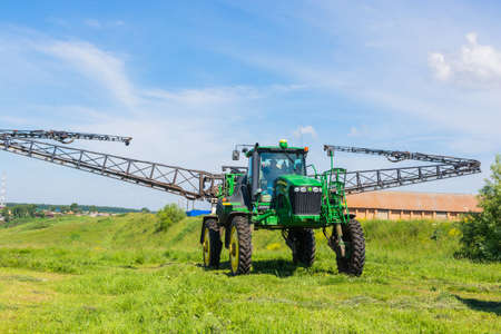 Krasnoyarsk, Russia - July 2, 2021: John Deere self-propelled sprayer on an agricultural field.