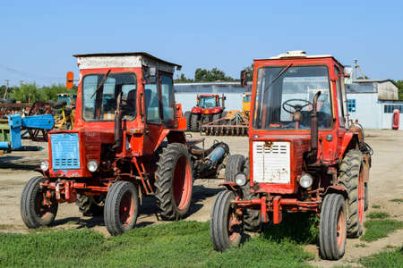 Russia, Temryuk - 15 July 2015: Tractor. Agricultural machinery tractor. Parking of tractor agricultural machinery. The picture was taken at a parking lot of tractors in a rural garage on the outskirts of Temryuk.