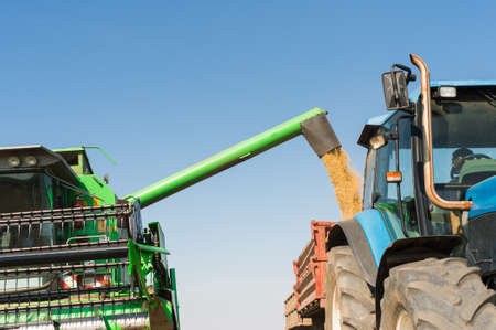 The machine for harvesting grain crops - combine harvester in action on rye field at sunny summer day. View from the combine cabin. The grain is loaded into the truck bodywork.