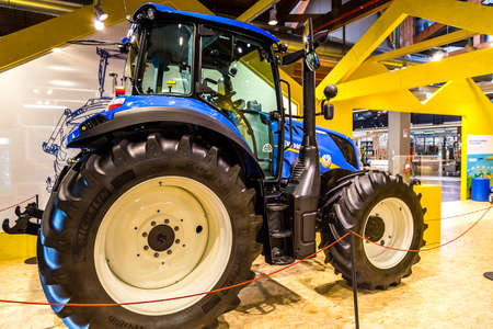 BOLOGNA, ITALY - OCTOBER 2, 2018: lights are enlightening New Holland tractor at FICO EATALY WORLD, the largest agri-food park in the world