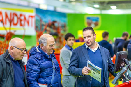 BOLOGNA, ITALY – NOVEMBER 10, 2018: Booth presenter welcoming business visitors at EIMA 2018, International Agricultural and Gardening Machinery Exhibition