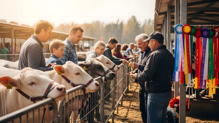 Group of men, women, and children viewing white cattle in pens at a livestock show with colorful prize ribbons