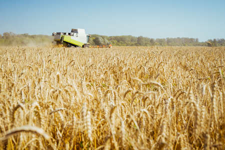 Combine harvester harvests ripe wheat. Agriculture. Selective focus