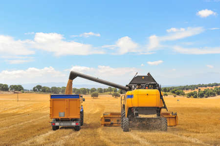 Combine-harvester pours wheat grain to trucks. Cloud blue sky. Horizontal. Working concept