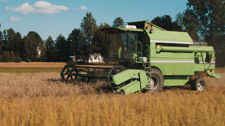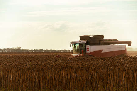Big green harvester in the field on a autumn sunny day mowing ripe, dry harvest sunflower seeds.