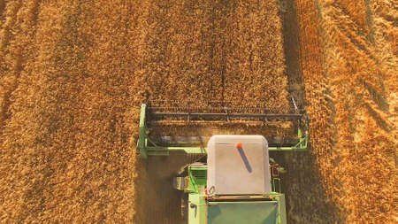 Combine moves on field. Top view of agricultural machine. Rich crop of wheat. Bread for the nation.