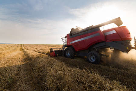 Photo of combine harvester that is harvesting wheat with dust straw in the air.