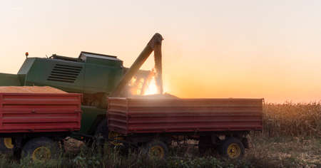 Pouring corn grain into tractor trailer after harvest