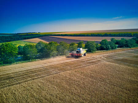 Combine harvester on the field of wheat. Perfect summer view from flying drone of harvesting wheat on sunset. Picturesque rural scene in Ukraine, Europe.
