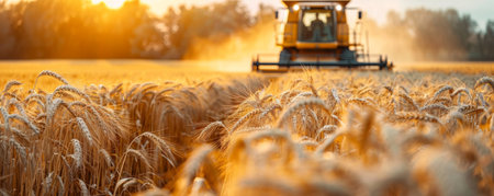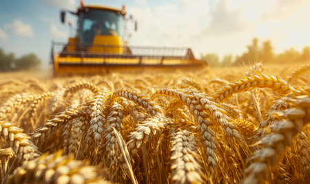 Ripened wheat crops standing tall, as a harvesting tractor works the field in a sunny agricultural scene