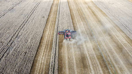 Aerial View Of Harvesting. Red Combine harvester harvests wheat in the field in sunny day.