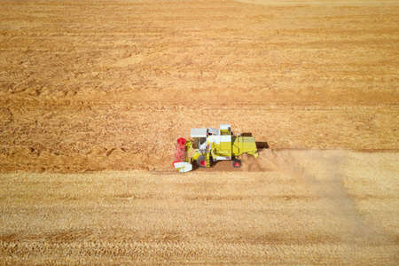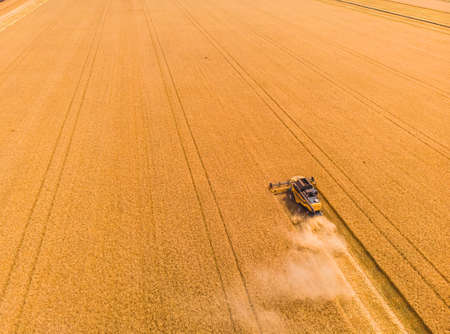 Aerial view of combine harvester working during harvesting season on large ripe wheat field. Agriculture concept