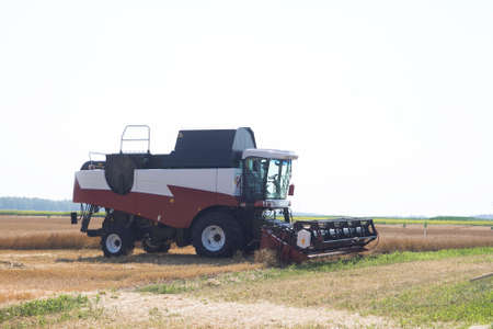 Agrarian industrial landscape with aggregates of a combine close-up, which collects a harvest on a rape field in a sunny day. (prosperity, food safety, recruitment - endpoint)