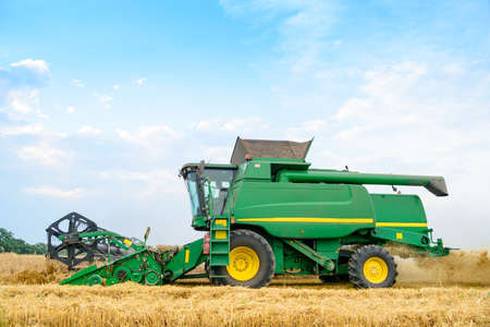 Warsaw, Poland 10.08.2020 - Side view of a green modern combine harvester with a cutter bar in a golden wheat field ready to harvest. Amazing cloudy blue sky in the background with trees.