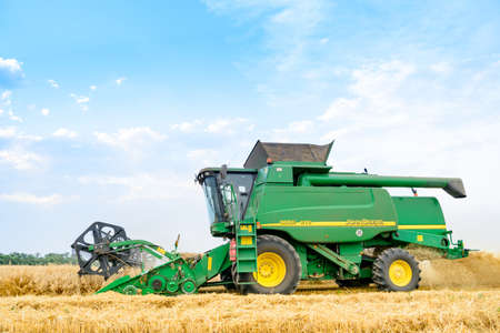 ZAPORIZHZHYA, UKRAINE - July 28, 2015: John Deere Combine Harvester Harvesting Wheat in the Field.