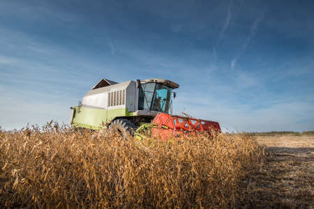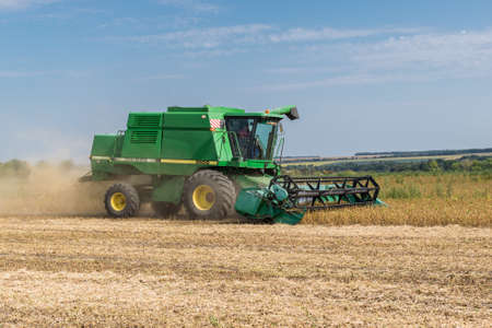 Kiev Region, Ukraine - September 10, 2017: John Deere 9500 Harvester is harvesting the soybean field on a summer autumn day