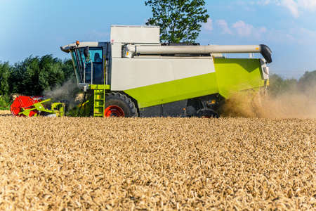 Combine harvester in action on wheat field. Process of gathering a ripe crop.