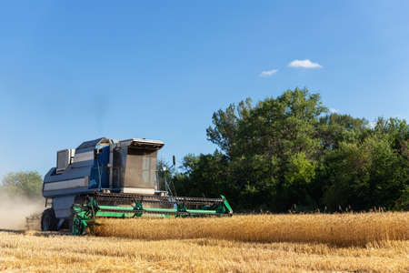 Combine harvester harvests ripe wheat. Agriculture. Selective focus