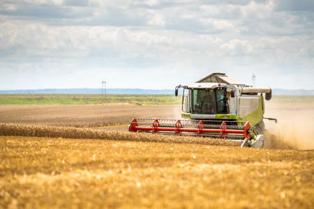 Combine harvester collecting golden wheat field, Harvesting machine working at agricultural field, Harvest reaping season