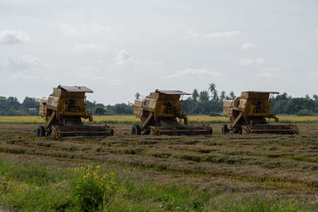 Georgetown, Penang/Malaysia - Feb 29 2020: Yellow harvester in paddy field.