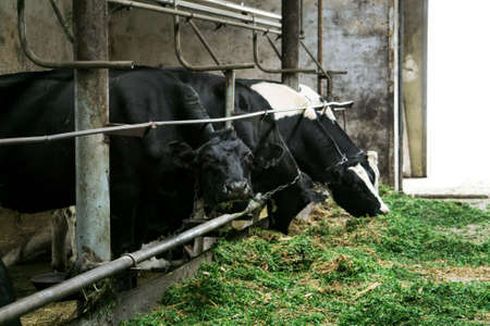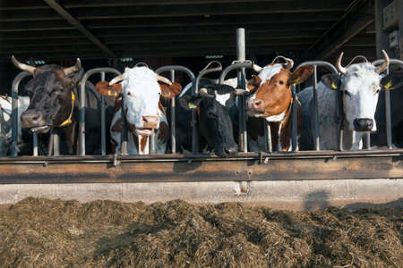 Milk cows on the farm are eating food dairy farm. Agriculture industry, farming and animal husbandry concept.